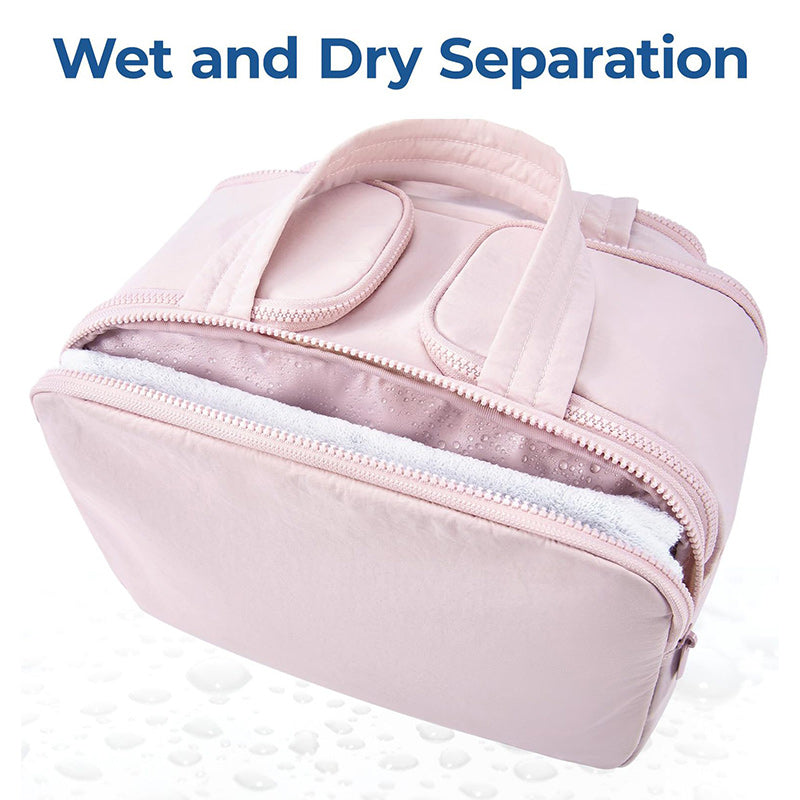 The large toiletry bag with a waterproof PVC fabric and a front zipper pocket can help keep wet and dry items separate and make it easy to clean.