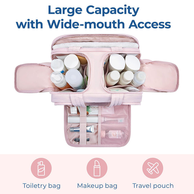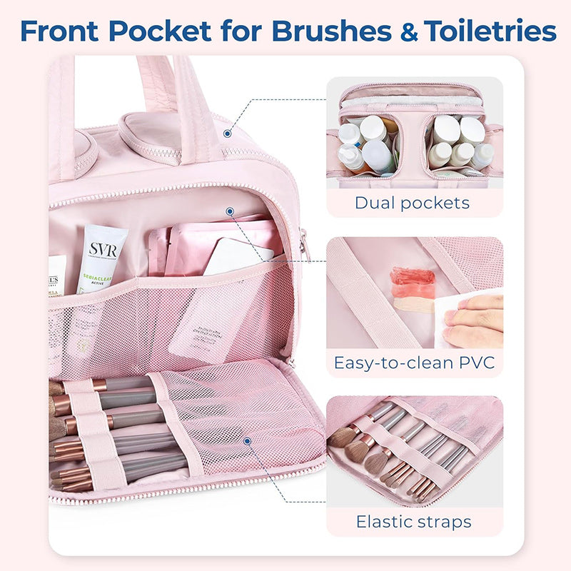 Full opening and not piling up for easy access to items. Double side full open design of travel bag keeps cosmetic bottles and toiletries can stand upright in the middle compartment. Avoid leakage during transit.