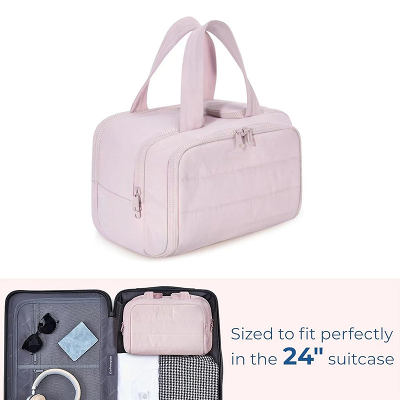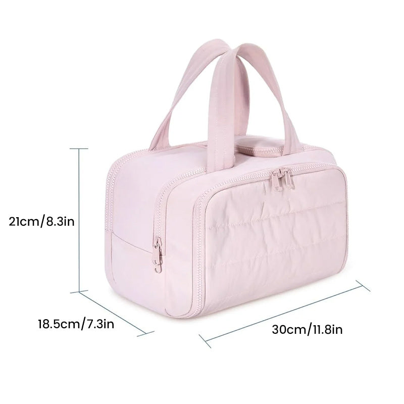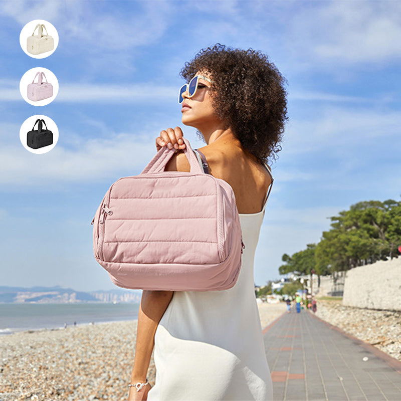 Made of soft and luxurious fabric. This puffer toiletry bag feels like cotton candy, giving people a relaxed and comfortable atmosphere.