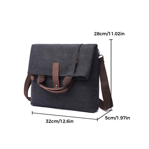 【Satchel size】 The canvas messenger bag measures 28* 32* 5cm. That can easily hold a water bottle and umbrella. Fits 15.6 inch laptop.