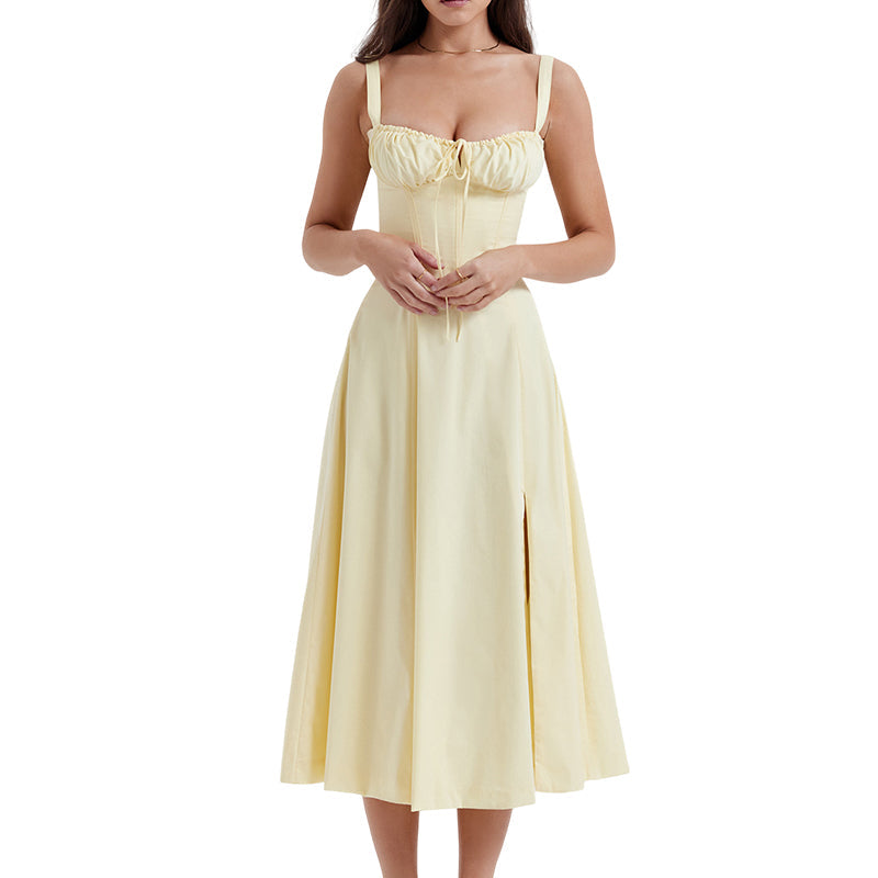 You'll feel ultra feminine in our dress that's the perfect match for spring and summer garden parties. It's cut from soft polyester in a gorgeous blue print hue and has a corseted bodice to cinch the fit with a beautiful lace up back. The gathered bust has a drawstring tie and the side split adds a little sexiness to reveal a flash of leg.
