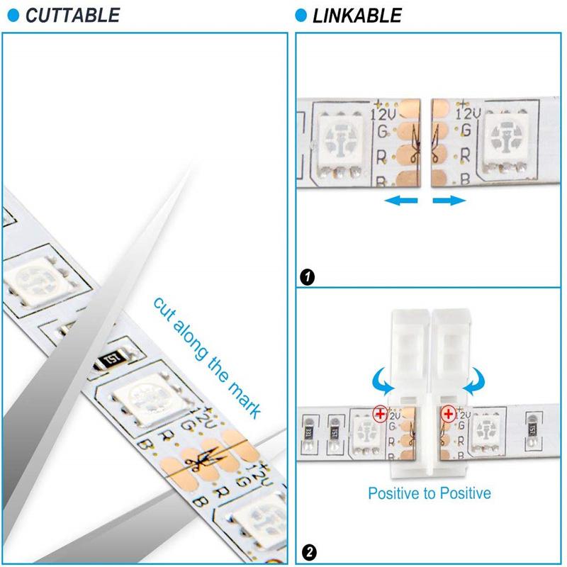 - CUTTABLE and LINKABLE: The LED strip lights could be cut every 3 LEDs along the cutting marks if you don't need such a long lights. Or you can buy some connectors to extend the lights for your bedroom, tv, desk, computer indoor.