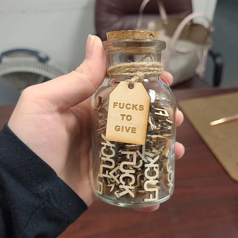 Whether this Jar of Fucks sits on your desk at work or on a bookshelf, let it be a physical reminder that your fucks are a precious resource. Don't let all the frustrations in the world distract you from what’s really important.😊