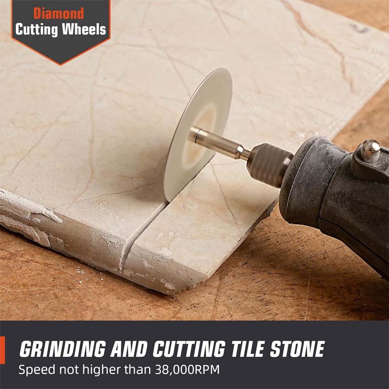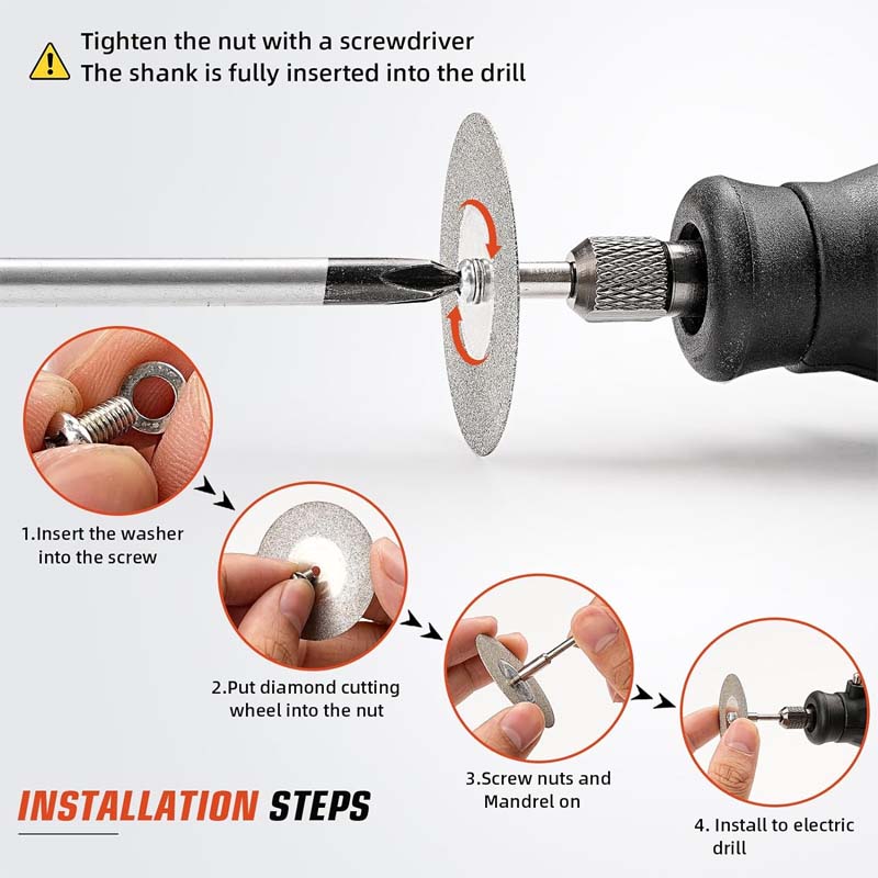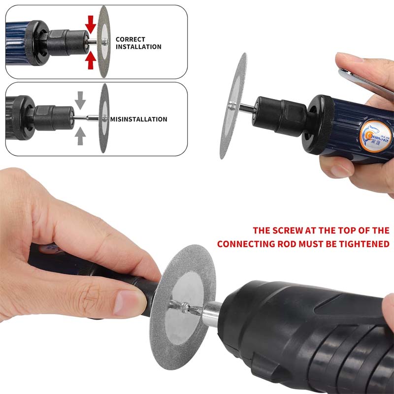 • ATTENTION -- When installing and using the accessory, you need to put the mandrel to the bottom, otherwise the machine will rotate at a higher speed and may throw off the cutting disc For your safety, please must wear gloves and goggles and be care around spark when using mandrel diamond cutting tools. It may become very hot when cutting, add some water to keep it cool.
