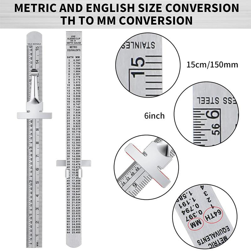 Steel ruler: the back of sliding steel ruler is engraved with a conversion table from inches to mm, which facilitates the conversion of various measurement data, offering you considerable convenience