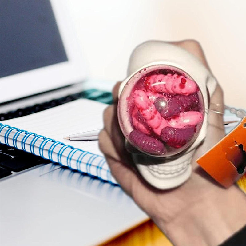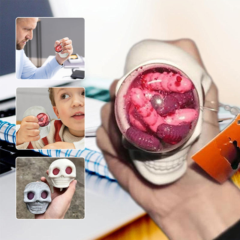 THE MOST FUNNY HALLOWEEN STRESS BALLS: When you squeeze the skulls, their eyeballs swell and become oddly shaped spheres filled with crawling, bloody little reptiles.