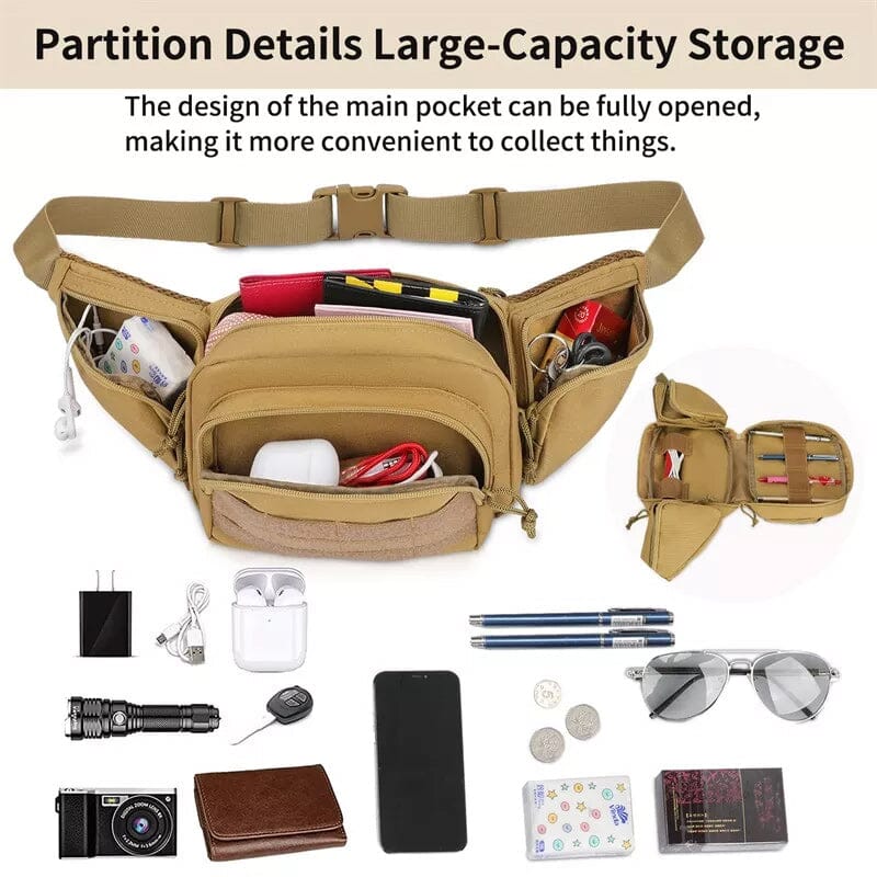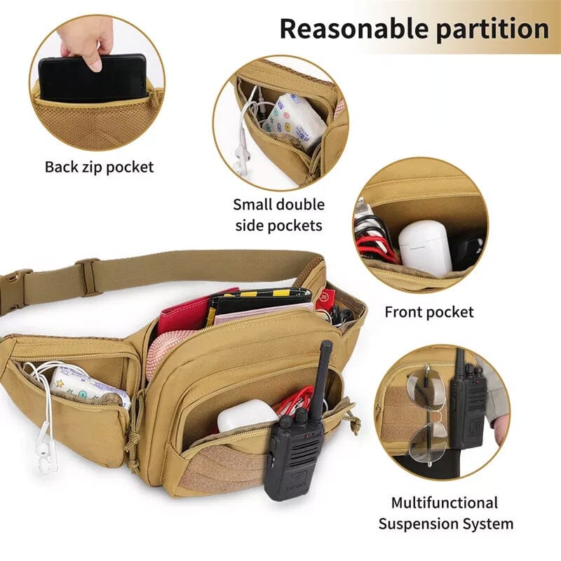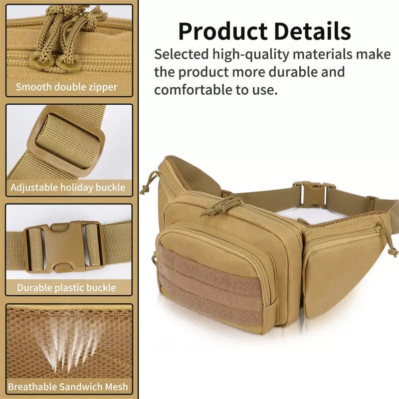 • Fabric: The tactical fanny pack is made of high quality 900D nylon which is scratch resistant and waterproof. The zipper is smooth and durable. It is lightweight, splash-proof, tear-proof, breathable and more durable.