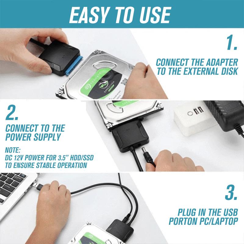This SATA hard drive adapter connects any standard 2.5/3.5" SATA HDD/SSD to a computer through USB 3.0 port and power adapter, useful for performing backups and file transfers